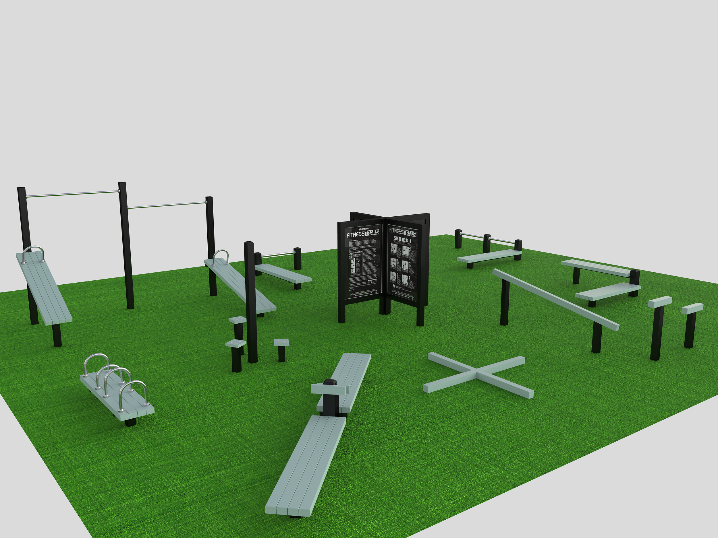 The configuration of 15 specifically selected pieces, allows the user to warm up, mobilize and stretch, build muscle strength, work cardio and cool down all in one 13m x 13m space.